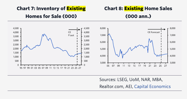 • Existing home sales are projected to be lackluster, reaching an annualized pace of 4.3 million in 2026 and 2027—well below pre-pandemic norms.